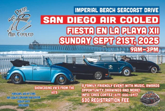 Over 250 air-cooled vehicles, Super Sonic Samba School Band and Dancers, Mariachi del Mar, Nasty Habits Classic Rock Band, raffle, vendors, VW Parts swap area. Seacoast Blvd. parking: $30 Plaza, beach and IB Pier parking: $40