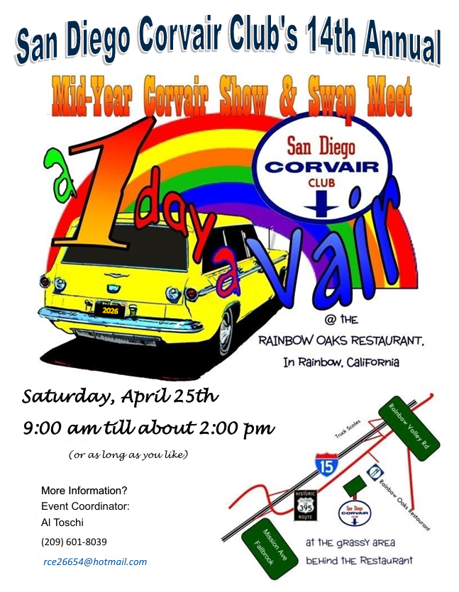 Corvairs Only ~ there will be approx. 20~25 Corvairs. All different makes & models and a Swap Meet