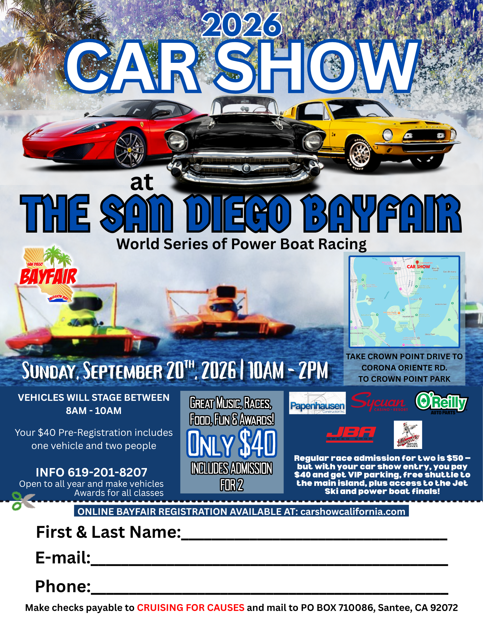 Regular race addmission for 2 is $50 - but with your car show entry, you pay $40 and get VIP parking, free shuttle to the main island, plus access to the Jet Ski and Power Boat Finals!