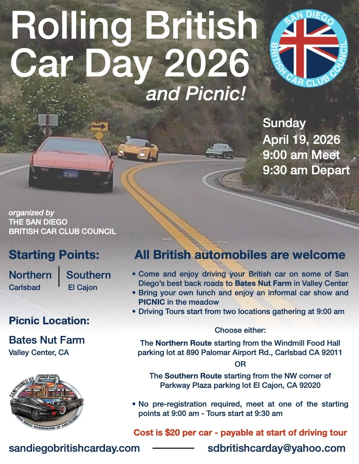 Drive through SD Back Country and PICNIC , starting in El Cajon AND Carlsbad, finishing with a picnic at Bates Nut Farm Valley Center. $20 registration fee
